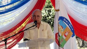 El presidente de Efemérides Patrias se dirige a los presentes y eleva el símbolo de la dominicanidad en la iglesia San Gregorio de Nigua.