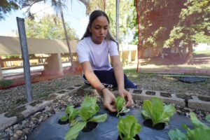 “Hemos sembrado lechugas, tomates, rábanos y ajíes, entre otros productos. Cuando ya los vegetales están listos, los llevamos al comedor; allí los lavamos bien y los servimos junto con la comida de todos los estudiantes”, narró la joven alumna.