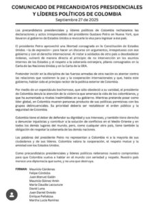“Los precandidatos presidenciales y líderes políticos de Colombia rechazamos las declaraciones y actos irresponsables del presidente Gustavo Petro en Nueva York, que llevaron al gobierno de Estados Unidos a revocarle la visa para ingresar a ese país”, dijeron.